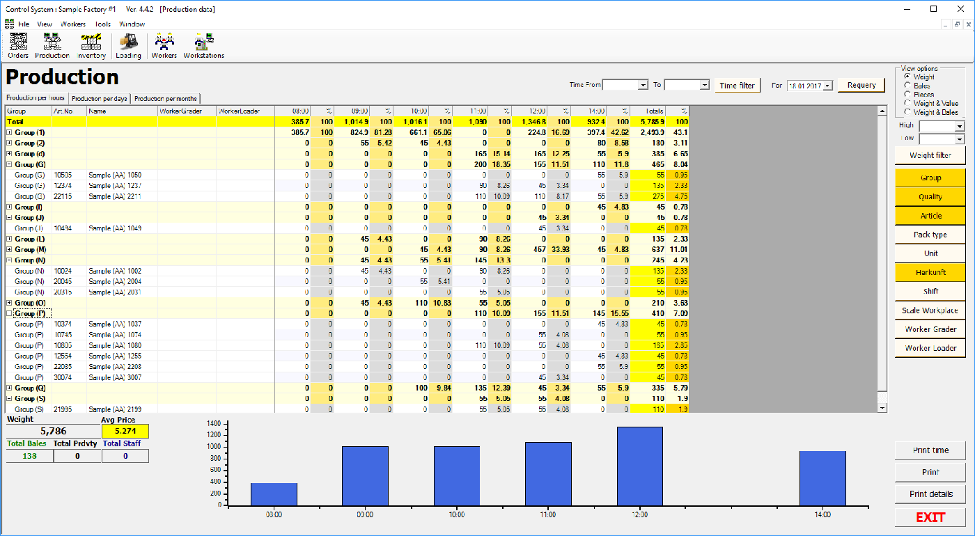 1. Production information with all details starting from year statistics and till detail per article, worker and every single package at each production workflow level precisely counted;