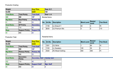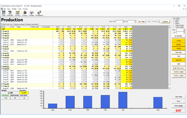 Combined console of system management at level of real time production statistics and managing production for finished and semi-goods, goods storage buffers, production semi-goods articles, workers and workplaces, loadings and active orders existing in the system
