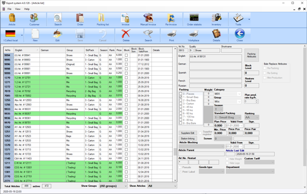 Section “Sales” allows to perform orders creation and management system with support of full sales process from order to invoice management and basic statistics browsing. Also it makes editing of connected reference lists as customers, articles of finished goods, etc.