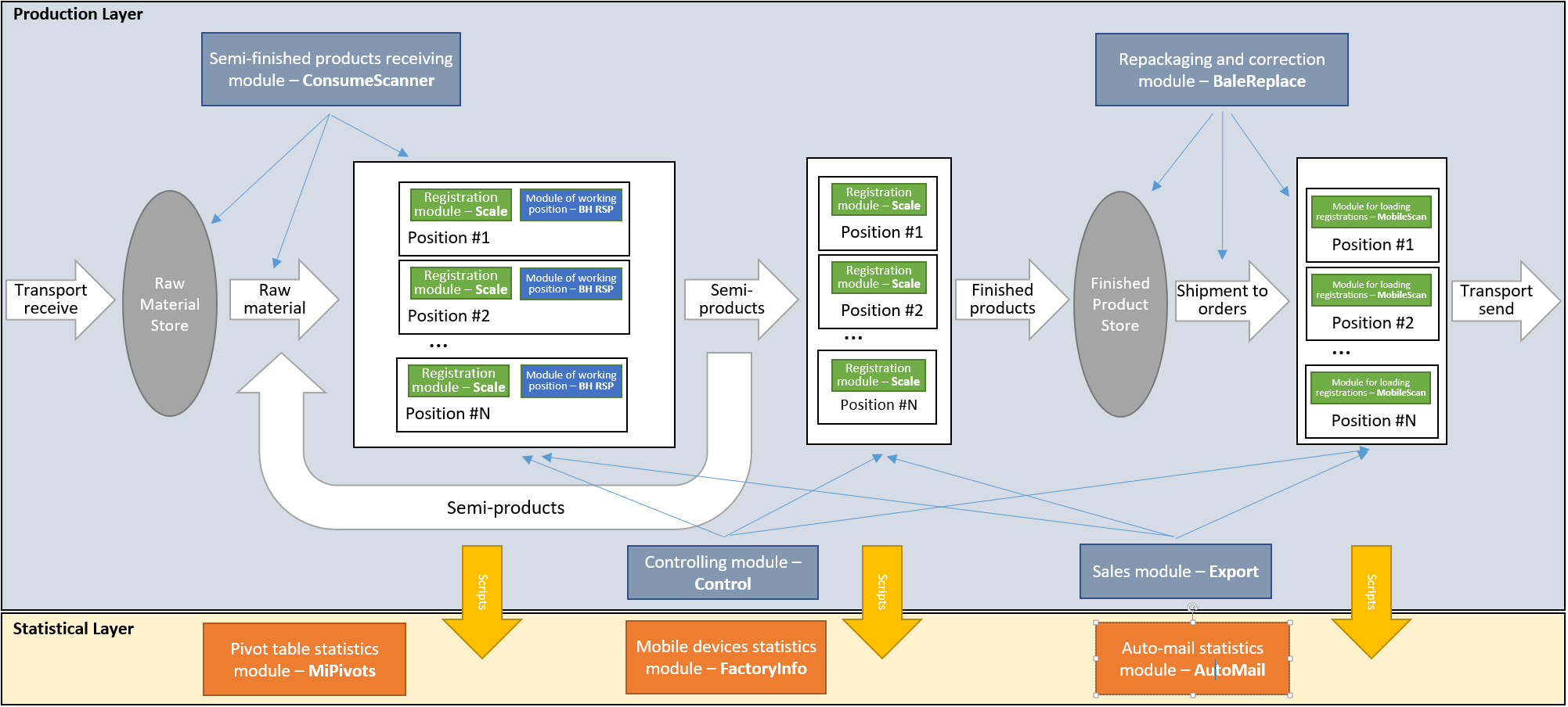 General overview schema illustrating main components in the production system, its relations in functionality and logical positions in whole system workflow