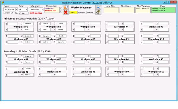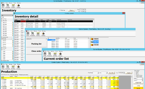 This module is a combined console of system management at level of real time production statistics and managing production for finished and semi-goods, goods storage buffers, production semi-goods articles, workers and workplaces, loadings and active orders existing in the system