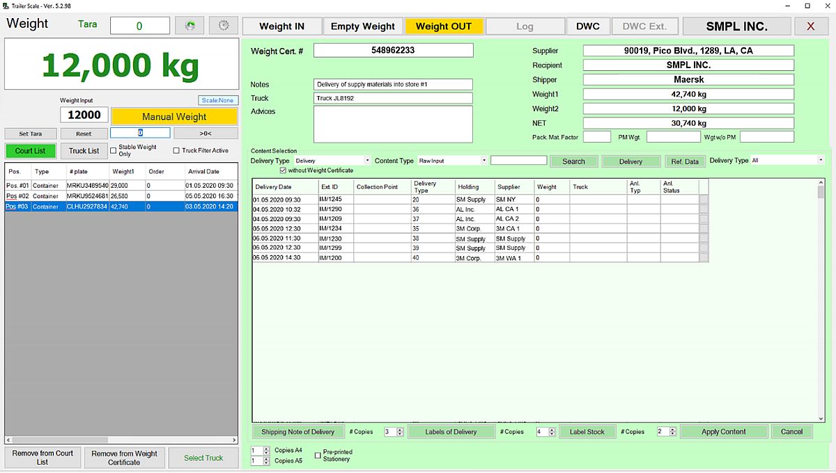 TrailerScale module is equipped with feature to receive weight automatically from connected weight hardware industrial measuring terminal unit of any suitable industrial standard with any applicable connection by network or data cable. This allows to calculate delivered weight automatically as difference between truck arrival and departure weights.