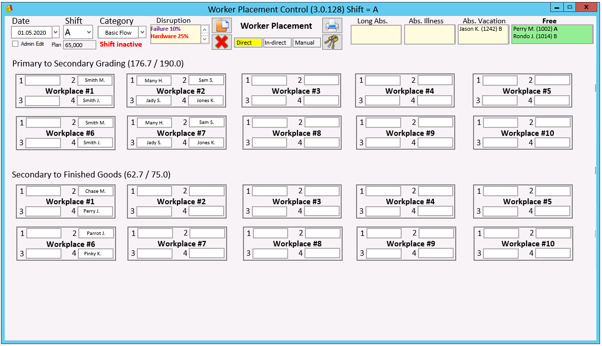 All actions are available for shift manager by drag-and-drop with real-time registration of placement during current running shift. In similar way is managed movement and presence of separate workers in logical buffers: