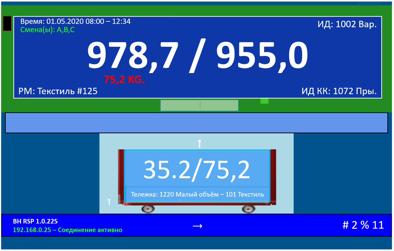 Модуль BH RSP позволяет отображать и регистрировать работу отдельных рабочих мест. Этот модуль выполняет отображение фактического обработанного веса в текущий момент времени в режиме реального времени и сравнение его с запланированным весом в текущий момент времени. Там будет легко распознаваемая цветная индикация состояния рабочих мест, которая включает в себя неактивный статус, когда ни один работник не зарегистрирован, активный статус с успешно выполненным планом до текущего момента (который будет отображаться зеленой цветовой гаммой) и не достигнутое значение плана, которое будет отображаться желтой цветовой гаммой.