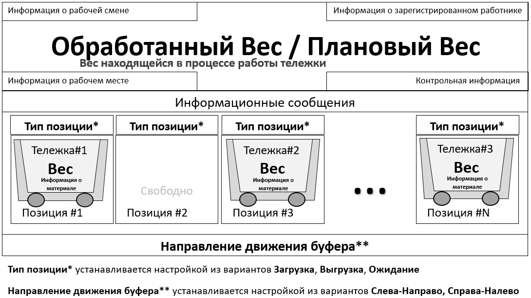 Модуль BH RSP имеет усовершенствованную детализированную панель в нижней половине экрана, которая отображает поток тележек через это рабочее место. Это позволяет увидеть подробную информацию о проходящих тележках, которая включает в себя тип перевозимого продукта, вес и другую информацию. Прохождение тележек регистрируется в режиме реального времени действиями рабочих на данной позиции и управляется считыванием сканированных штрих-кодов или RFID-меток.