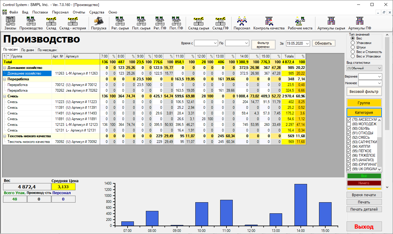 5. Детальная статистика заказов, производства по весу, штукам и стоимости на уровне отдельных упаковок для каждого уровня производственного процесса;