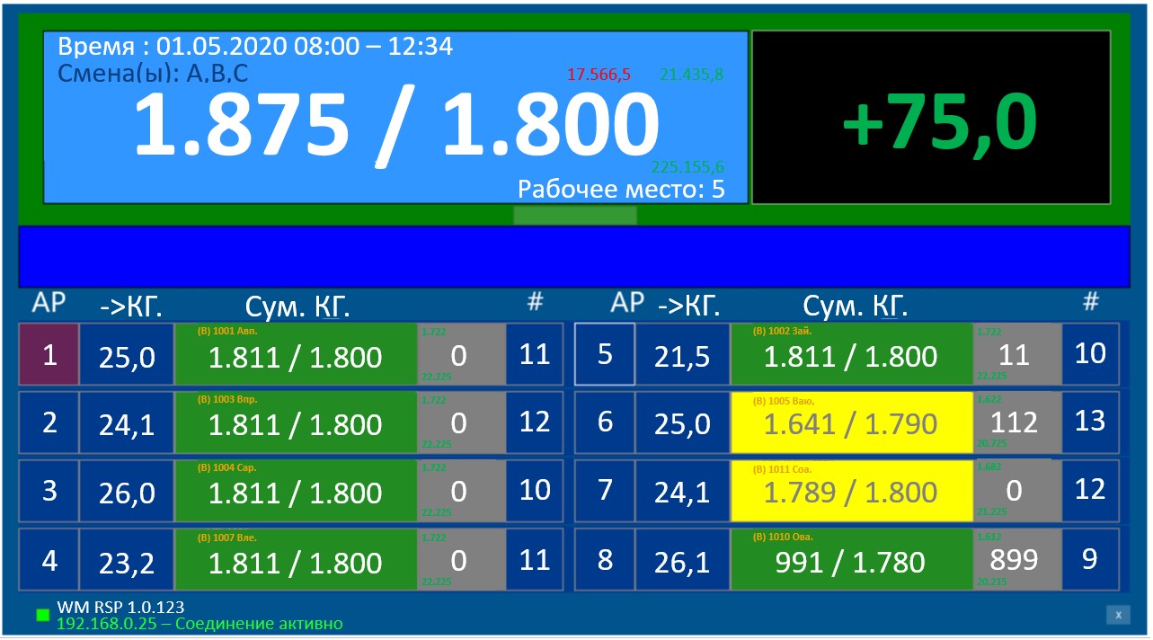 WM RSP позволяет отображать и регистрировать командную работу нескольких рабочих позиций, объединенных вместе на одном рабочем месте. Этот модуль выполняет отображение фактических выполненных и запланированных параметров в каждый текущий момент времени. Эта информация отображается для уровня значений отдельных рабочих позиций, а также суммируется уровень всей команды, работающей на рабочем месте.